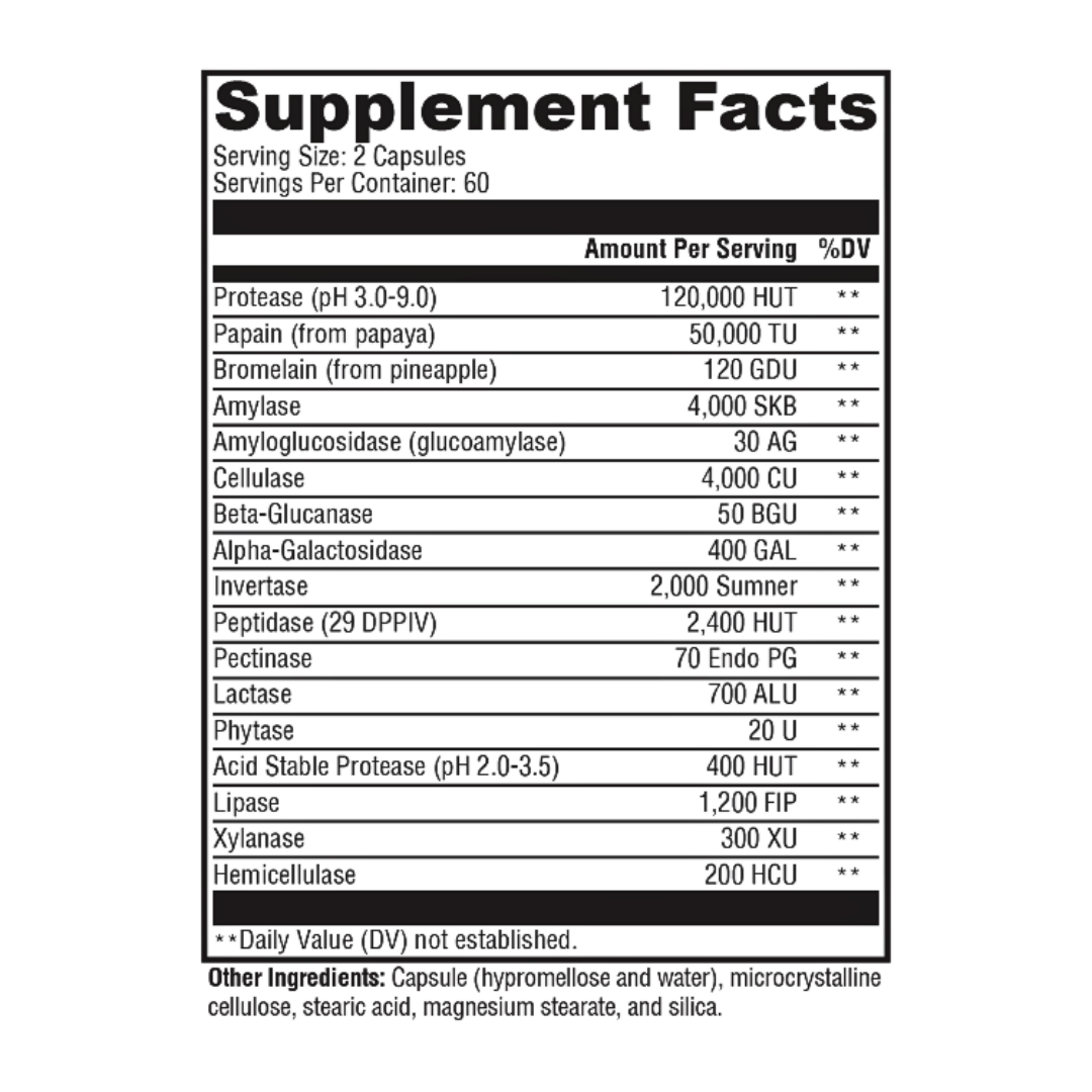 Supreme Digest is a cost-effective, non-prescription, broad-spectrum, digestive enzyme formula suitable for vegans and designed to support the digestion of fat, protein, carbohydrate, fiber, and lactose. This comprehensive formula contains lipase, proteases, alpha-galactosidase, hemicellulase, papain, lactase, and other key digestive enzymes. Supreme Digest works in a wide pH range—unlike porcine pancreatin, which works in a narrow pH range.*